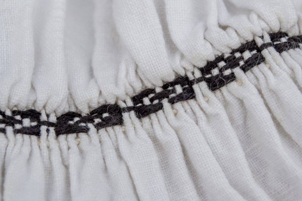 Ca să fie frumoasă ia ei, cum n-are alta, a ales frunza și ramurile copacului – înțelepciunea – sau părți din copacul vieții. Frunzele de stejar care înseamnă regenerare / înviere. Pe piept crenguțele cu frunze de diferite mărimi reprezentă bucuriile și necazurile vieții – care mai mare, care mai mică, care mai intensă, care mai ușoară. Nu lipsește de pe ie nici Sf. Treime sau cele 3 etape majore din viață (Naștere, Cunoaștere, Moarte) – în crenguța cu 3 frunze. Ochiul lui Dumnezeu sau cercul e pus la încrețitura mânecii să-l simți mereu cu tine când te ține strâns de mână. Pe guler sunt colții lupului în semn de protecție și calea ocolită (pentru ca necazurile și răutățile să nu-i apară-n viață). Iar chiar în marginea gulerului este rombul cu mijloc – pământul cu sămânță în el – fiecare cuvânt să aibă o sămânță de bunătate.